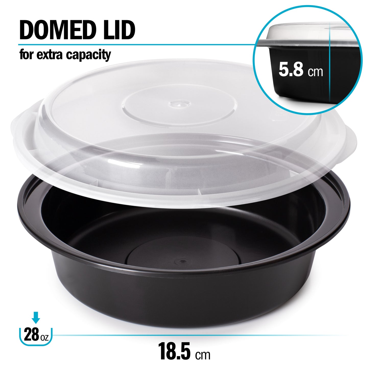 Round, compact, and ready for leftovers or lunch. Volume: 828ml (28oz) | Dimensions: 18.5cm x 5.8cm | Material: BPA-free food-safe PP5 plastic